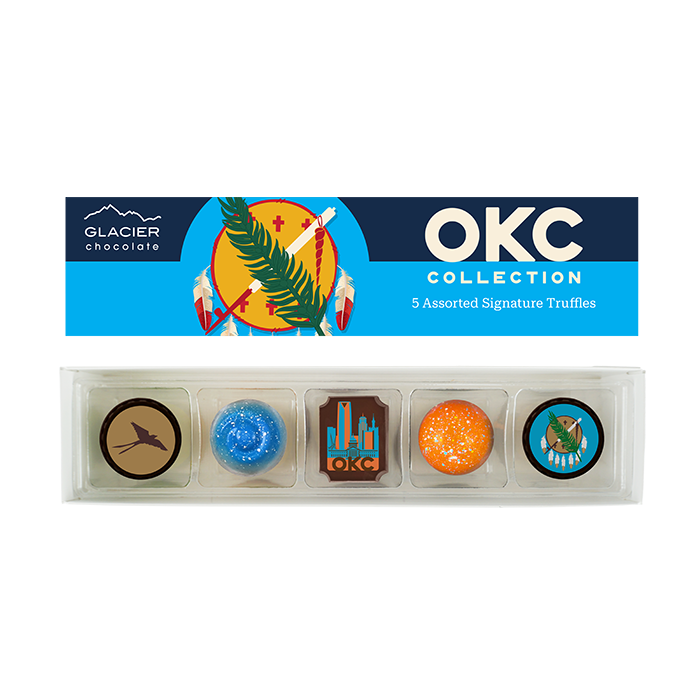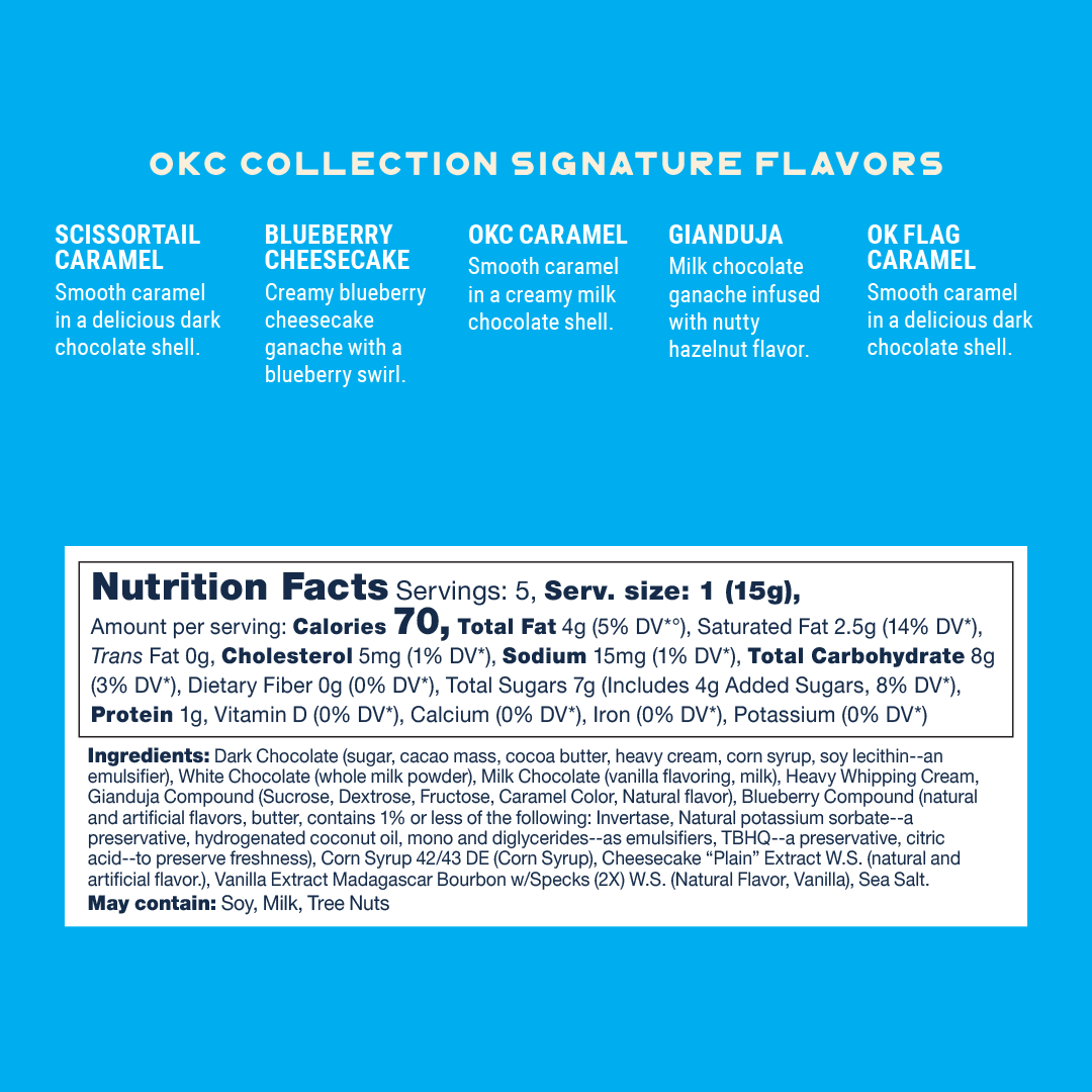 Introducing our 5-Piece OKC Collection. This box is a delicious and artistic tribute to OKC! Featuring a milk chocolate caramel decorated with the iconic OKC landmarks, a caramel with the Oklahoma Flag, a caramel adorned with the scissortail state bird, and our nutty Gianduja and creamy blueberry cheesecake Signature Truffles. This box is a nod to OKC’s rich history, culture, and natural beauty.